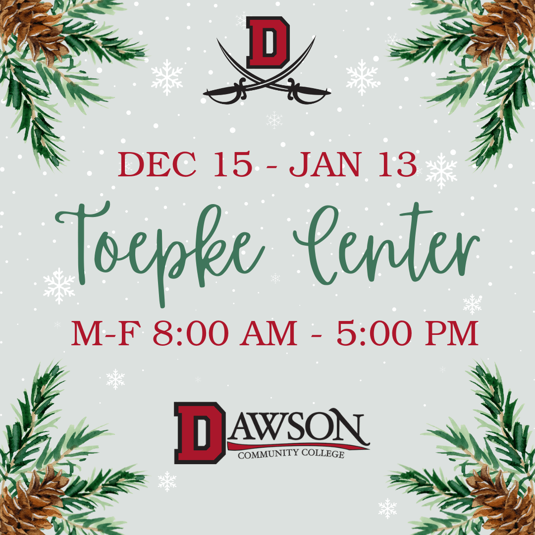 December 15 - January 13, the Toepke hours of operation are 8:00 am-5:00 pm, M-F