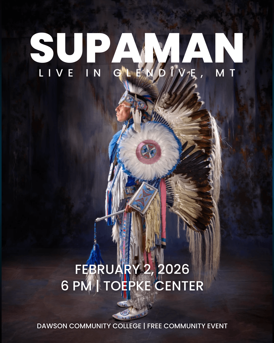 Supaman—award-winning Indigenous hip-hop artist—brings a high-energy live performance to the DCC Toepke Center on February 2 at 6 PM. Blending hip-hop with traditional dance and storytelling, Supaman delivers a show that inspires all ages and celebrates Native excellence.